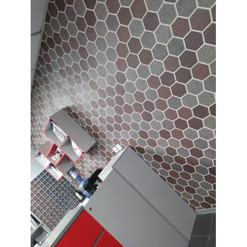В состав материала входит мраморная крошка, акрил и сетка, на которую наклеены декоративные элементы.
